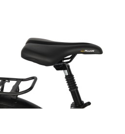 Za komfort jazdy odpowiada amortyzowany widelec SR Suntour NEX z blokadą skoku, który skutecznie tłumi nierówności, a w razie potrzeby można go usztywnić na gładkim asfalcie. Dodatkowo amortyzowany wspornik siodła oraz żelowe siodełko Velo Plush zwiększają wygodę nawet podczas dłuższych tras.